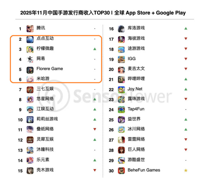 SensorTower的数据显示,2025年11月中国手游发行商全球收入总榜,腾讯、点点互动、柠檬微趣与网易位居前四。